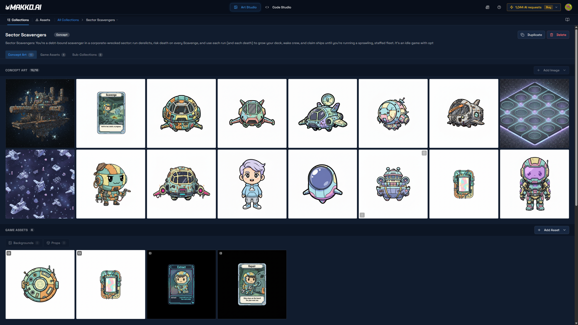 In Makko's Art Studio, consistency is handled at the system level through Collections. A Collection is the container for an entire game's art. You create one Collection per game, generate concept art that defines the visual direction, and every character, background, and object created inside that Collection inherits the same art style.