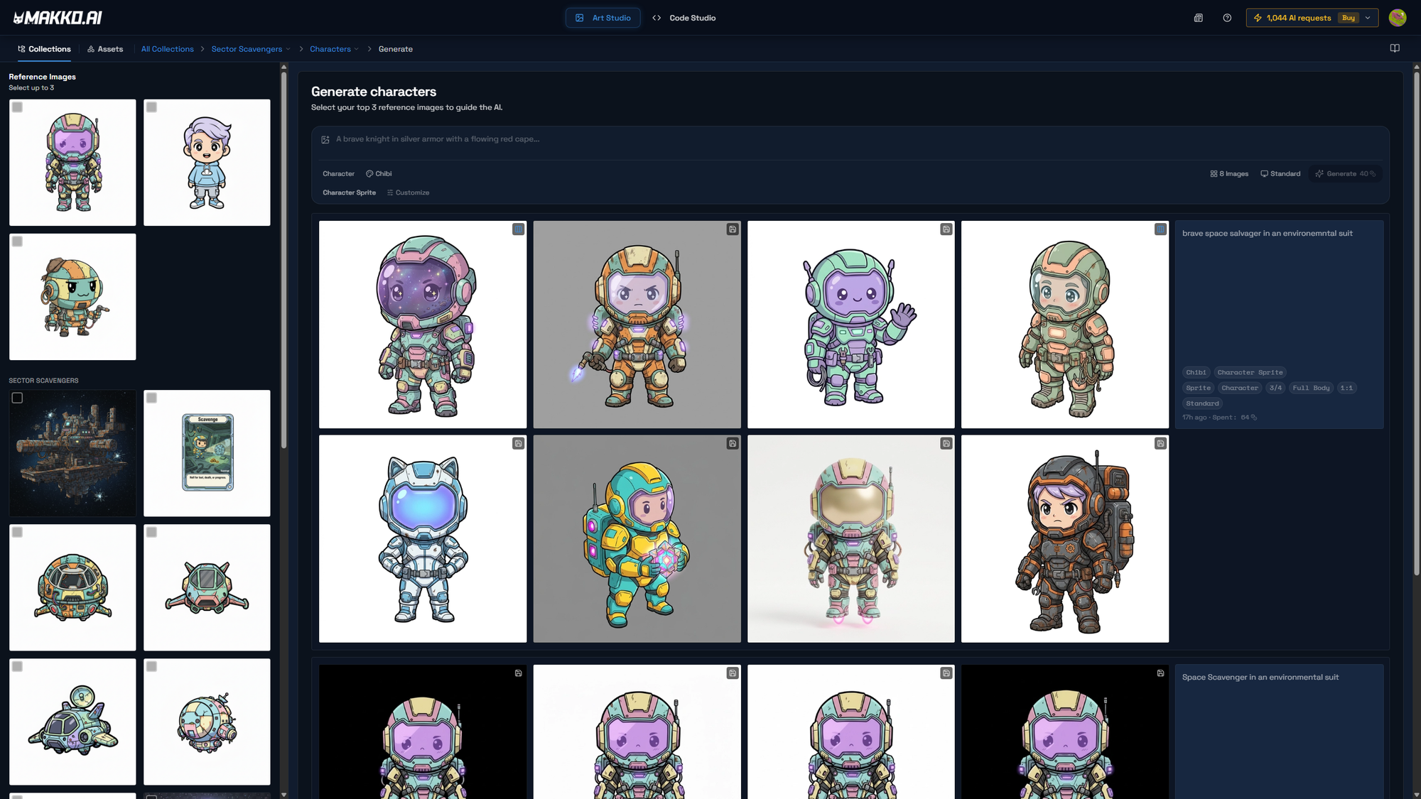 For Sector Scavengers, prompts like "brave space salvager in an environmental suit" and "space scavenger in an environmental suit" produced a full grid of variations in a single generation pass — different armor configurations, color combinations, and facial expressions, all consistent with the established chibi sci-fi style. Selecting the right reference images before generating kept each new character visually connected to the ones already in the collection.