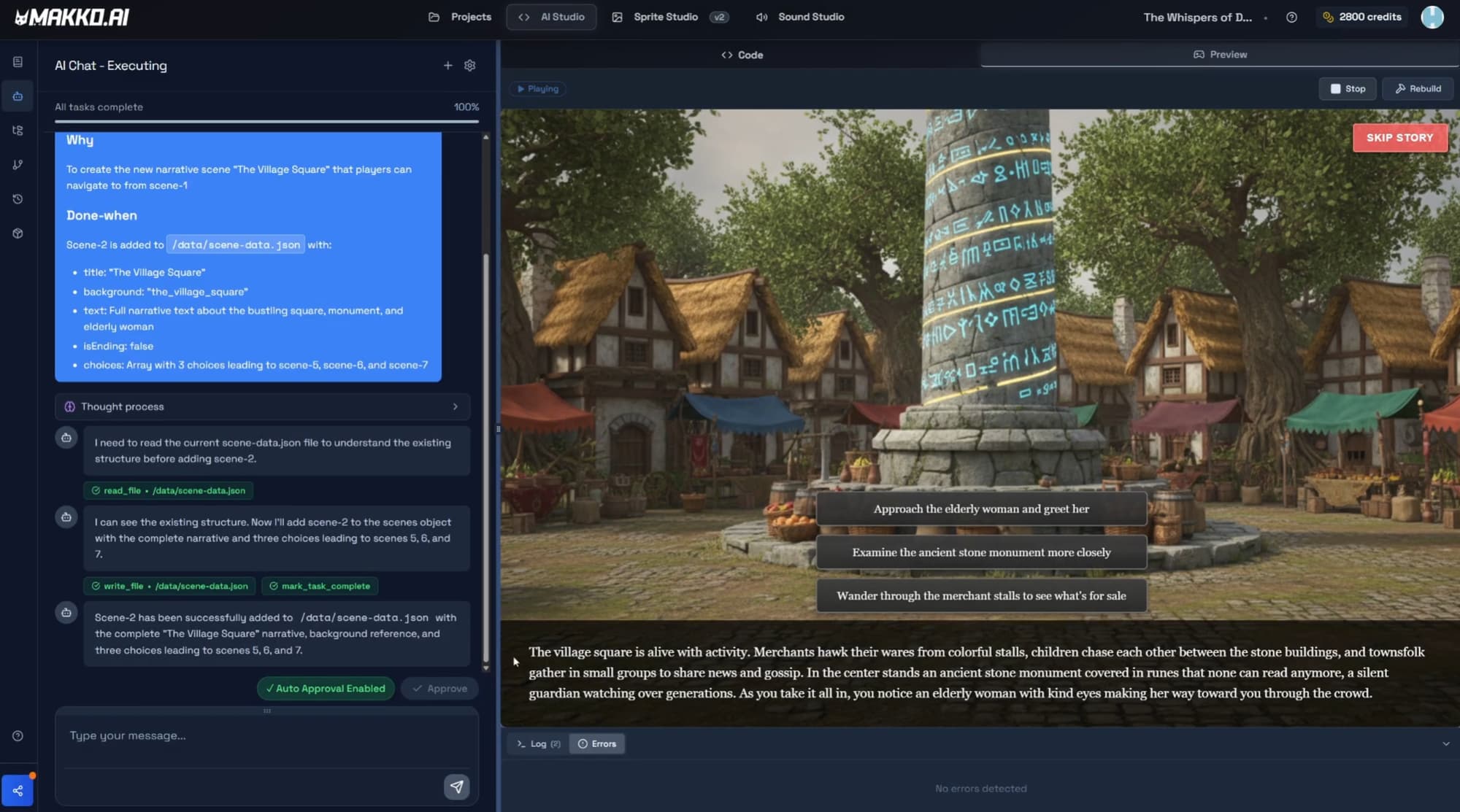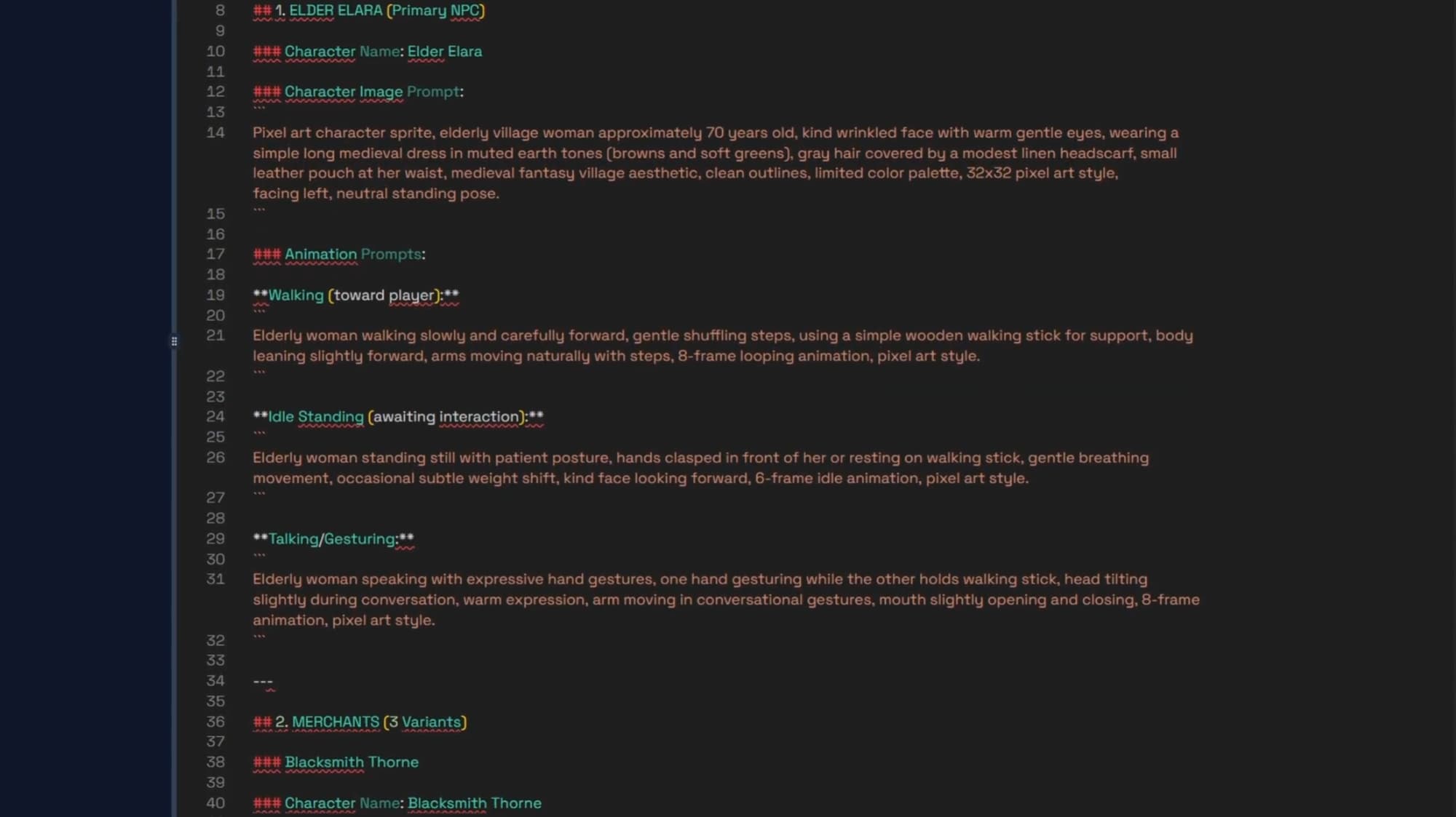 The suggestions generated from the narrative included an elderly main NPC with expressive animations, merchants to simulate a busy market environment, and children and townsfolk to create environmental depth. None of these required the creator to brainstorm from a blank page. The AI drew from the story's own context to propose characters consistent with the world already established.